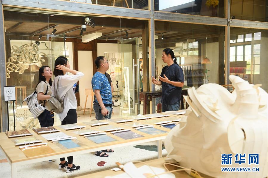8月22日,图书馆创始人、设计师张雷(右一)向来访者介绍图书馆情况。 在杭州余杭青山村,有一个名为融设计图书馆的空间。这里对中国传统文化、艺术与工艺材料进行梳理,除了从各地收集的数以千计的传统手工艺品,图书馆还集聚了上百位国际设计师以此为灵感的再创作。同时,图书馆也藏有大量设计相关书籍,供来访者查阅。 新华社记者 翁忻旸 摄
