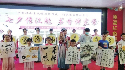 本报讯 穿针乞巧、乞巧祈福、书法家即席挥毫、诗朗诵……前天,在七夕节到来之际,一场别具特色的七夕习俗活动——“七夕传汉魂 书香伴霓裳”在市博物馆举行,吸引了不少观众前来参与。