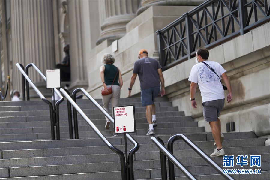 8月27日,在美国纽约大都会艺术博物馆第五大道主馆外,参观者从提示保持距离的告示牌旁走过。当日,受新冠疫情影响关闭5个多月的纽约大都会艺术博物馆第五大道主馆对会员重新开放,并将于29日起正式对公众开放。重新开放后,大都会艺术博物馆采取多项措施防控新冠病毒,包括限制参观人数、强制戴口罩、测量体温等。新华社记者王迎摄