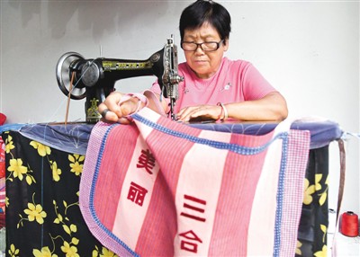 村民王翠粉在缝制三合村旅游纪念品围裙。通过打造“手绘小镇”,三合村吸引了越来越多的游客。
