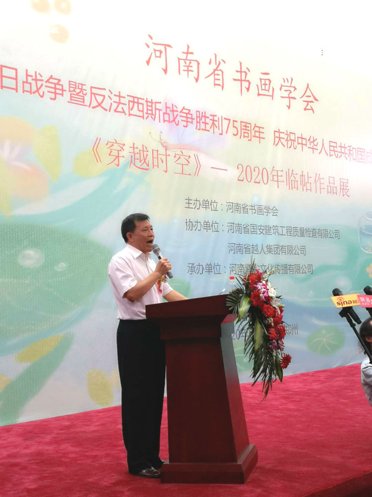 为纪念抗日战争暨反法西斯战争胜利75周年、庆祝中华人民共和国成立71周年,2020年9月12日上午10时,由河南省书画学会主办,河南省国安建筑工程质量检查有限公司、河南省越人集团有限公司协办的《穿越时空》——2020年临帖作品展,在河南郑州隆重召开。