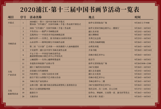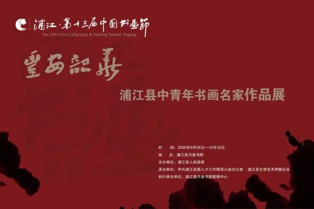 2020浦江第十三届中国书画节将于9月26日—10月8日举行。本届书画节致力于展现浦江丰富的文化内涵,推动书画文化的交流和创新,做强“万年浦江”文化品牌,打造“重要窗口”期的浦江文化新高地。