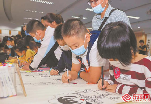 作为第八届海峡青年节系列活动之一,第七届榕台中小学生书画交流展27日在福州举行,现场展出两岸特邀嘉宾作品、学生一等奖作品50余幅。图为开幕式现场小朋友们挥毫作画。本报记者 陈梦婕 摄