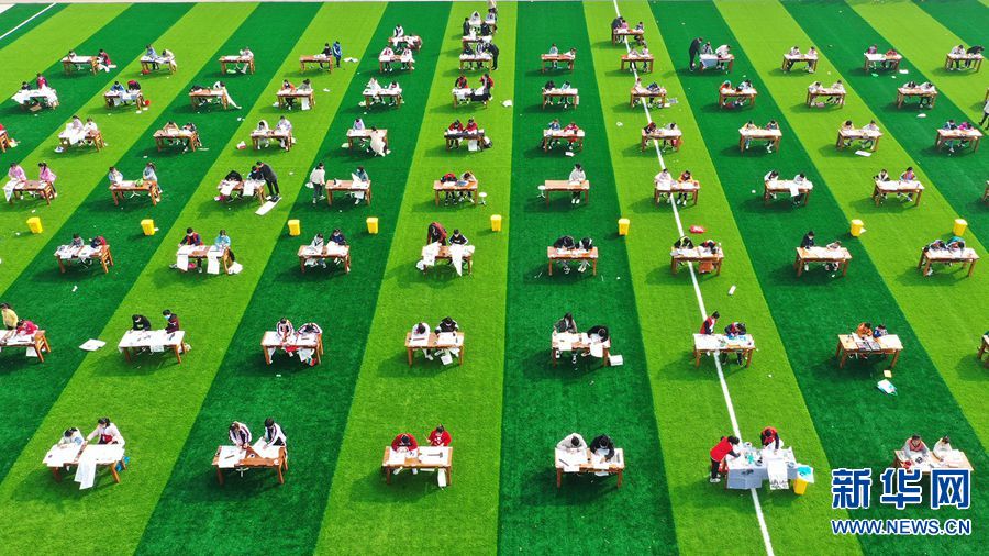 11月1日,河南省扶沟县新村小学足球场,中小学生书法爱好者在进行书法比赛。