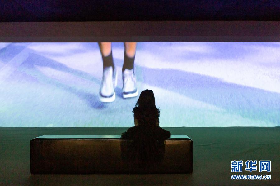 11月26日,一名小姑娘坐在大屏前欣赏参展作品。