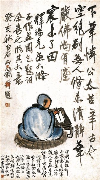 此次展出的一张《钟馗图》,齐白石就在题款上写明瑞光在古代的瓷器上看见了钟馗的形象,觉得好,就放大了画成一幅画,呈给自己指点。自己改完了觉得确实好,便也画了一张。齐白石还作有多幅《大涤子作画图》,也源于弟子瑞光。瑞光一生倾心于石涛(别号大涤子),他将自己画的《大涤子作画图》交予齐白石评定,齐白石修改后,也几度创作《大涤子作画图》,并且在题跋里谈及瑞光在人物画方面的探索,也提到了自己作品的来源。
