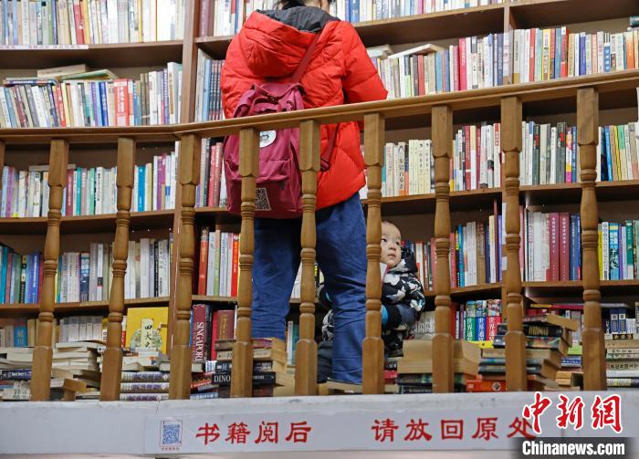市民带着孩子在复旦旧书店内寻找书籍。 殷立勤 摄