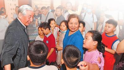 8月30日,“天道酬勤力耕不欺——张海八十初度新作展”在省美术馆开幕。张海先生与观展小朋友热情交流书法。本报记者史长来摄大河网讯(河南日报记者温小娟)8月30日下午,河南省书法家协会成立40周年座谈会在郑州举行。记者从会上了解到