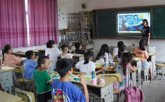 7月23日,在庐山市蛟塘镇中心小学安置点,一名小朋友展示自己的绘画作品。 受近期洪水影响,江西省庐山市蛟塘镇部分村庄遭受灾情,一些受灾群众被安置在蛟塘镇中心小学安置点。为丰富安置点孩子们的生活 7月23日,在庐山市蛟塘镇中心小学安置点,一名老师在指导孩子绘画。新华社记者 张浩波 摄