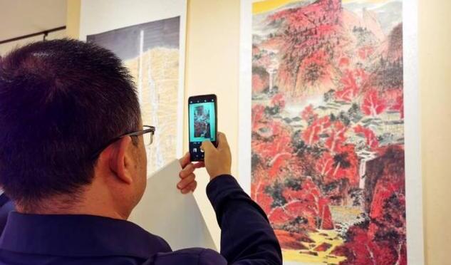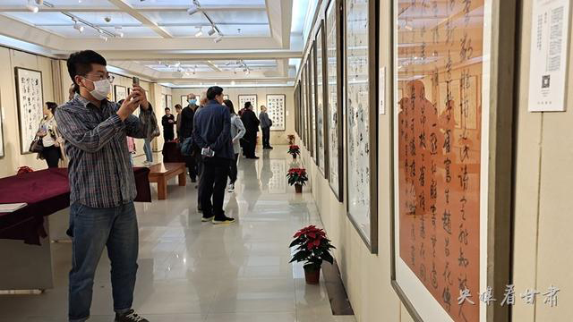 10月12日,“‘脱贫攻坚 读者同心’中国书法之乡·镇原书画作品巡展”在兰州开幕。图为书画爱好者拍摄展览作品。高展摄中新网兰州10月12日电 (闫姣 艾庆龙 高展)“镇原县是书法之乡,百姓家家挂书法、户户书丹青,将书画视作高雅之物。