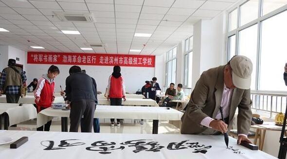 滨州市高级技工学校校长王树林为将军书画家们介绍学校建设情况大众网·海报新闻记者 王卫 郭峰 孙佃潇 滨州报道展纸挥毫,笔走蛟龙,浓浓墨香氤氲在空气之中,精致宁静的山水斗画、苍劲有力的书法跃然于宣纸之上……10月10日上午