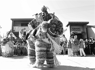 近日,民间艺人在山西省运城市稷山县清河镇表演“高跷走兽”。当日,稷山县清河镇举办“高跷走兽”闹新春民间社火表演活动,众多村民前来观赏。“高跷走兽”是当地特色民间表演艺术,被列为国家级非物质文化遗产。两人足踩高跷协调一致同演骑兽状,人与“兽”巧妙结合,伴随着鼓乐声演绎神话传说。