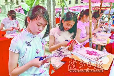 被誉为“潮阳民间艺术三瑰宝”之一的潮阳剪纸,在活动现场也进行传授展示。杨立轩 摄