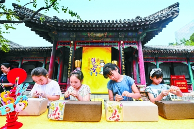 游园会中,游客还可以体验七夕文化创意活动、选购节日文创“信物”。民间传说农历七月七日是魁星的生日,魁星主文事,想求取功名的读书人特别崇敬魁星,所以一定在七夕这天祭拜,祈求他保佑自己考运亨通,期盼“一举夺魁”。陶然亭公园将慈悲庵文昌阁内的魁星石刻进行比例复制,制成木板,在文创礼物店与游客进行拓刻互动体验。