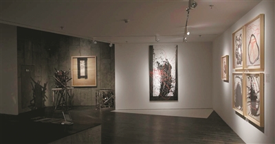 在展览现场,由袁新进行导览。他认为,艺术家仇德树的作品可以用“宣纸即笔墨”和“裂变”两个关键词来概括。前者是其艺术形式的特点,后者是其艺术的主题。他的作品既是中国传统绘画艺术的现代形式的表达,也可以说是用中国传统艺术的符号来呈西方现代艺术的观念。艺术家秦风的作品非常多元,其艺术创作的涉猎面也非常广泛。在西方现代艺术实践的语境中,秦风通过提取中国传统书法艺术的形式,以及其呈现的中国道家的阴阳观念(画面上呈现为黑白的强烈比对)来展开其艺术创作,使得其作品呈现出更多的艺术观念,并实现了东西方文化超时空的交流。此外,《灵与肉》的雕塑或是装置作品则关注的是人和技术之间的张力,自然和工业之间的矛盾。艺术家赵梦的作品也可以用两个关键词来概括,那就是作为艺术创作手段的“陶瓷烧制”和作为艺术创作主题的“文人供石”。他是用现代的创作形式、手法和语言来实现中国文化与现代的对话,实现中国传统艺术表达符号的现代转变。