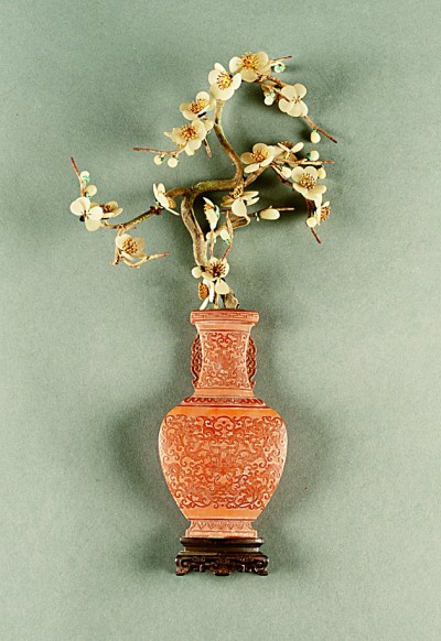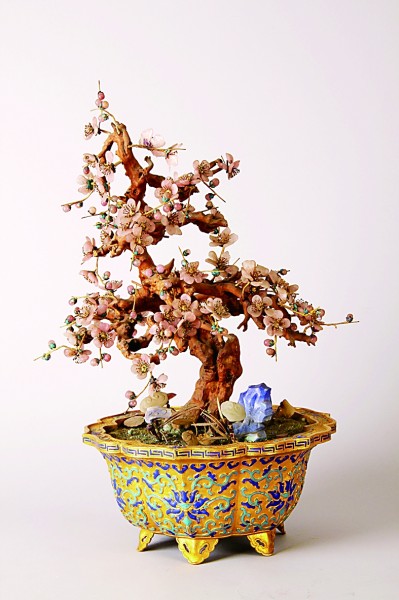 清宫旧藏的铜錾胎珐琅菱花式盆芙蓉石梅花盆景颇具代表性。它通高40厘米,盆径33厘米,菱花式铜镀金盆,盆口朝外一圈饰蓝色“T”字纹,盆腹錾胎填珐琅缠枝花纹,祥云纹足底。盆面以碎宝石铺地,芙蓉石制成满树的五瓣梅花,烧蓝花托,铜镀金花蕊,旁衬灵芝玉片、青金石假山和铜片小草,精美异常。