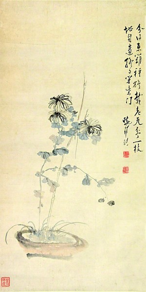 在张晓村所绘“盆菊图”中,可见画幅引首题诗:“分得东篱种,旋栽老瓦盆。一枝堪自适,终日闭柴门”。钤有白印二枚、朱印一枚。画中绘浅盆之中立一株菊花,以一根细秆相扶,另一株枝叶懒懒地垂落。画风简率古朴。作者似在观照自己,虽然独处世外,但怡然自得。