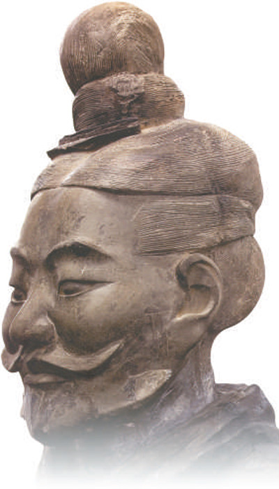 展厅中,两件珍贵的秦兵马俑引得观众纷纷驻足,时隔2000多年,站在秦兵马俑前仍能感受到秦军雄壮而威严的气势。兵马俑坑出土的一行行、一列列排列整齐的步兵、骑兵、车兵陶俑,将中国历史上第一个统一王朝的气势表现得淋漓尽致。从陶俑面部特征看,有关中大汉,也有羌人、戎狄人等其他民族成员,这是统一国家中多民族共存的实证。