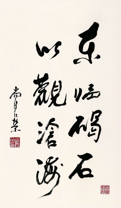 应春彦之邀我送了两件书法作品,一件是书写的曹操诗句“东临碣石,以观沧海”,一件是书写了《贞观盛世》中魏徵的唱词“梨花凝春韵”。都与我在京剧舞台饰演的剧目有关。