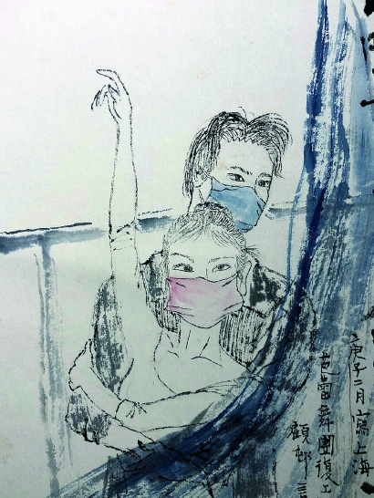 这次呈现的一些书画是自己疫期心情的真实纪录,如第一次乘地铁时看到口罩乘客的速写,以及看到摘下防护服后的女护士满脸口罩印痕、上海芭蕾舞团演员坚持戴口罩排练的感动,还有欲到梅园写梅花而不能进园的无奈。