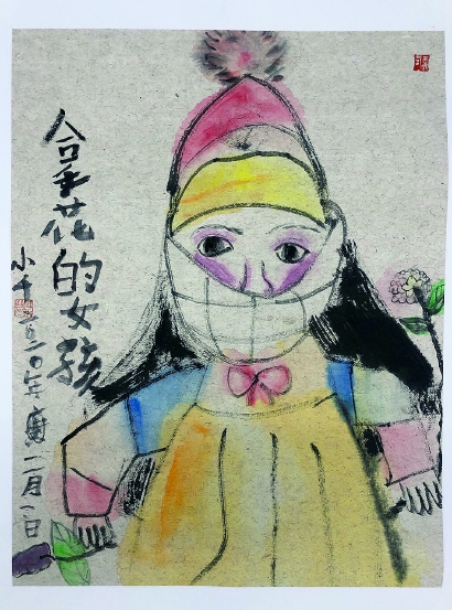 海报上的这幅画是谢爷爷希望我画一幅戴口罩的画。我画画时就让女孩除了戴口罩,还戴了个帽子,只露出两个大眼睛,而且一只手拿一朵花,感觉这样很美。