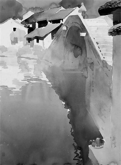 作为海派水彩画的领军人物,张英洪特别强调水彩的民族性与时代性,其作品笔法轻盈灵动,色调清新雅致,水色交融,富有中国山水画的意趣。记者在云展览中看到,他早期的作品以江南水乡风景为主,兼具诗情与画意。如《高高的石拱桥》把江南水乡的小桥、流水、人家表现得清新而明净。石拱桥下流淌着的河水映出周边房屋、树木、船坞的倒影,它们随着波光律动,朦胧中呈现出东方水墨般的诗韵。