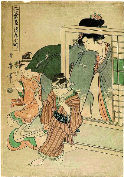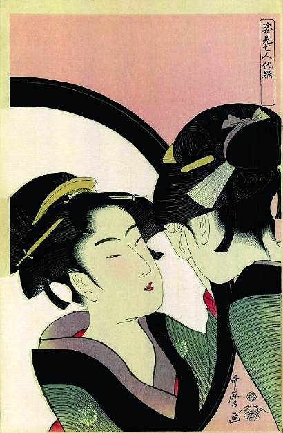 “美人绘大师”喜多川歌麿,在行云流水般的线条和色彩间,将理想化的女性形象表现得尽善尽美。《姿见七人化妆 难波屋阿北》是其作品中非常特别的一幅,画中的人物形象不仅通过充实的线条来描述,而且还以镜子为媒介展现了两种不同的空间。