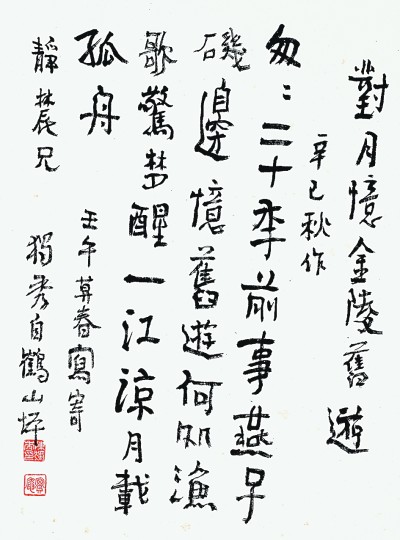 陈独秀书法碑帖结合,篆隶行草,各体兼备,信笔挥洒,狂放不羁,大气磅礴,各臻妙境。其传世翰墨,多系羁押狱中及蛰居江津时期所写,或诗稿或书札或对联,以行草为主,纯从王羲之《十七帖》《初月帖》演化而出,夹杂大小篆书,率性而作,不为成法所羁,行笔随意,线条洒脱,字势雄逸,文笔跌宕,汪洋闳肆。1932年在南京狱中为刘海粟书行草联“行无愧怍心常坦,身处艰难气若虹”,足见其胸襟宽博,秉性耿介。1935年《题刘海粟古松图》诗“黄山孤山,不孤而孤,孤而不孤。孤与不孤,各有其境,各有其图”。不拘于物,境界阔大。1941年于四川江津曾书自作诗《对月忆金陵旧游》行书赠台静农:“匆匆二十年前事,燕子矶边忆旧游。何处渔歌惊梦醒,一江凉月载孤舟。”笔墨沉着苍莽,气格疏朗高古,台静农称誉道:“体势雄健浑成,使我惊异,不特见其功力,更见此老襟怀,真不可测。”这些书作,表现出他深厚的文化底蕴、坚定的人生信仰。