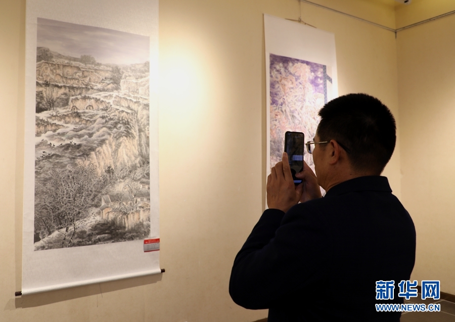 观众为书画作品拍照留影。新华网发(王生元 摄)