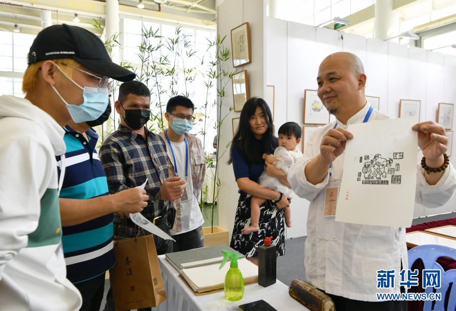 11月27日,国家级非物质文化遗产传承人、杭州十竹斋斋主魏立中(右一)向观众展示他现场印制的木版水印作品。