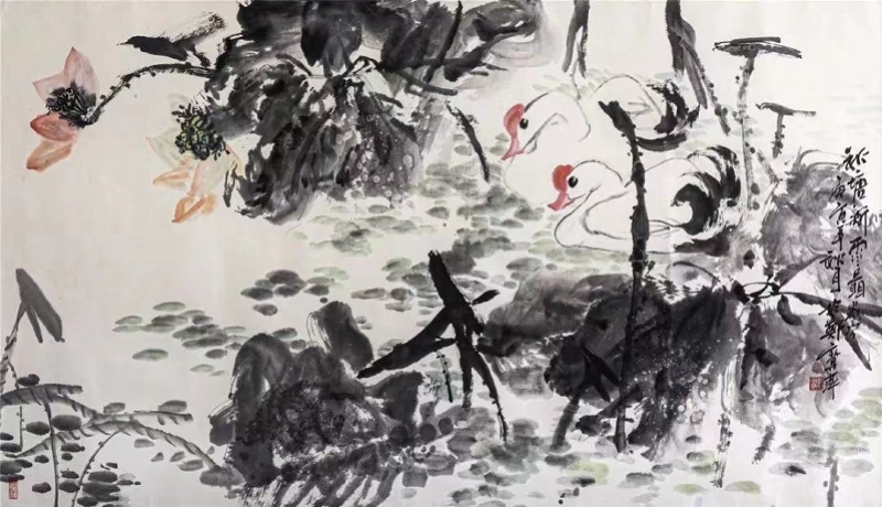 贾宝萍的写意花鸟画具有雅、清、逸、趣、韵、朴等特点。从他的《翠岭初雪》《山野秋歌》《盛春花月夜》等作品中,可以看到其对齐白石笔墨的传承和借鉴。其作品呈现出纯朴的乡土意识和浪漫天真的童趣,具有回味无穷的诗意。