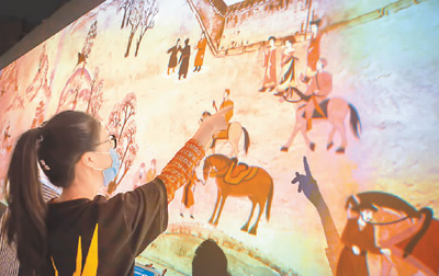 走进山西博物院会展中心一层,展墙上一幅动态娄睿墓鞍马游骑图映入眼帘。伸手触摸壁画,山西历史名人、大唐“神探”狄仁杰以动画形象“走”出来。轻轻擦拂壁画,画面由暗变亮,狄仁杰化身“导游”......