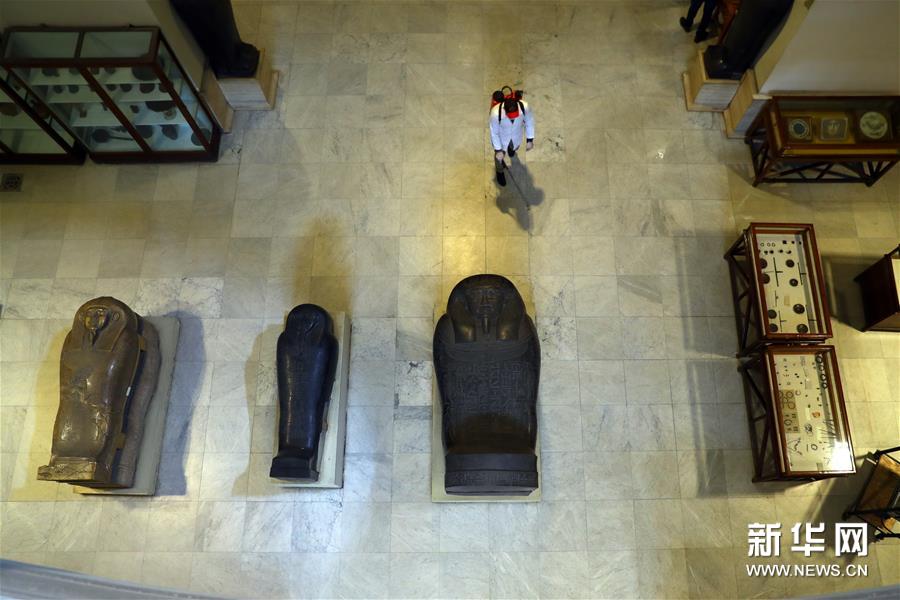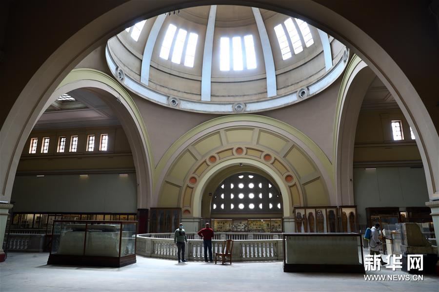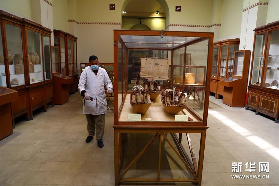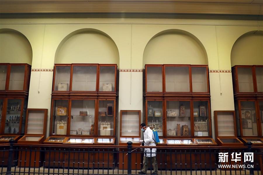 3月23日,一名男子在位于埃及首都开罗市中心的埃及博物馆内进行消毒。新华社发(艾哈迈德·戈马摄)