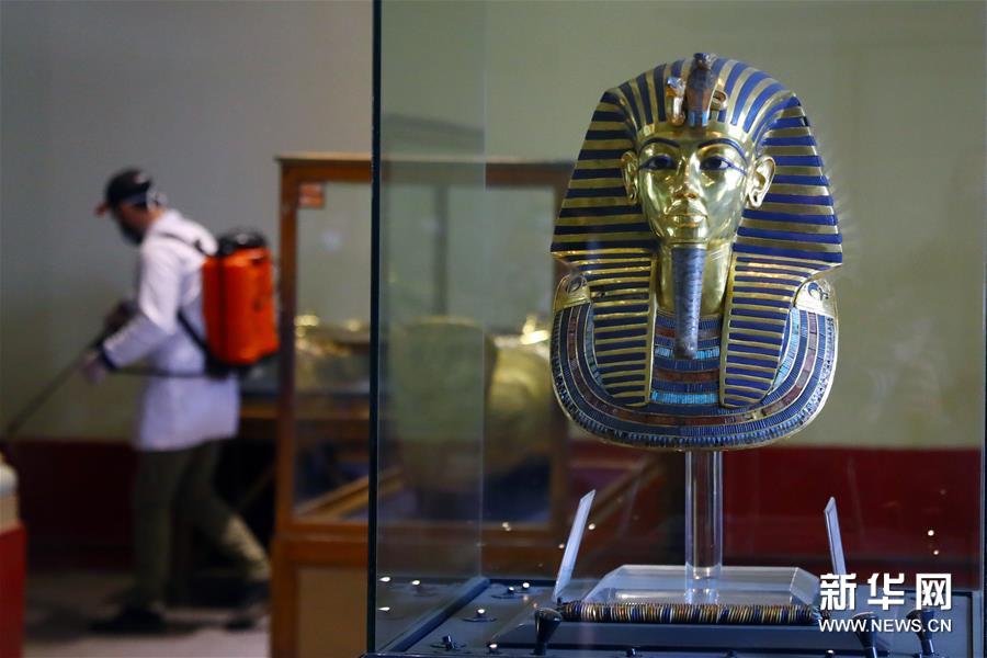 3月23日,在位于埃及首都开罗市中心的埃及博物馆,一名男子在图坦卡蒙黄金面具旁消毒。新华社发(艾哈迈德·戈马摄)