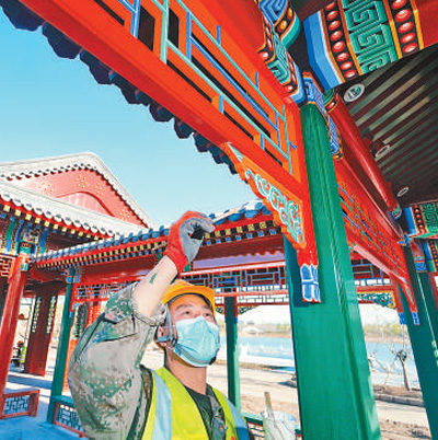 4月2日,来自北京城建的工人正在樱花庭院进行最后的彩绘作业。本报记者 贺勇 摄