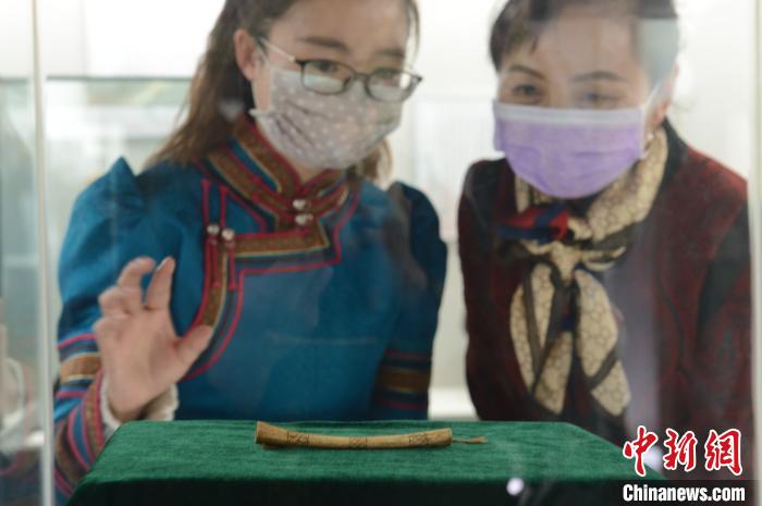 4月1日,人们参观内蒙古马头琴艺术博物馆内的蒙元鹰笛,该器物从蒙古国境内的元代墓葬中出土,长度115毫米,开五孔,属于竖吹的气鸣乐器。刘文华 摄