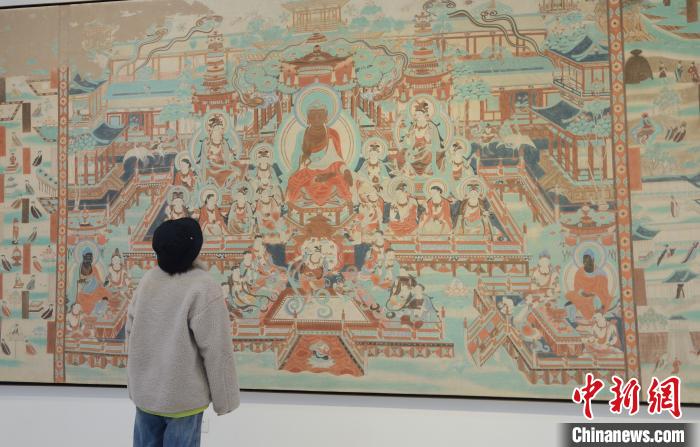 4月1日,斯琴塔娜艺术博物馆内,一位游客在观无量寿佛经变图摹本前驻足,该画作临摹自榆林窟壁画。刘文华 摄