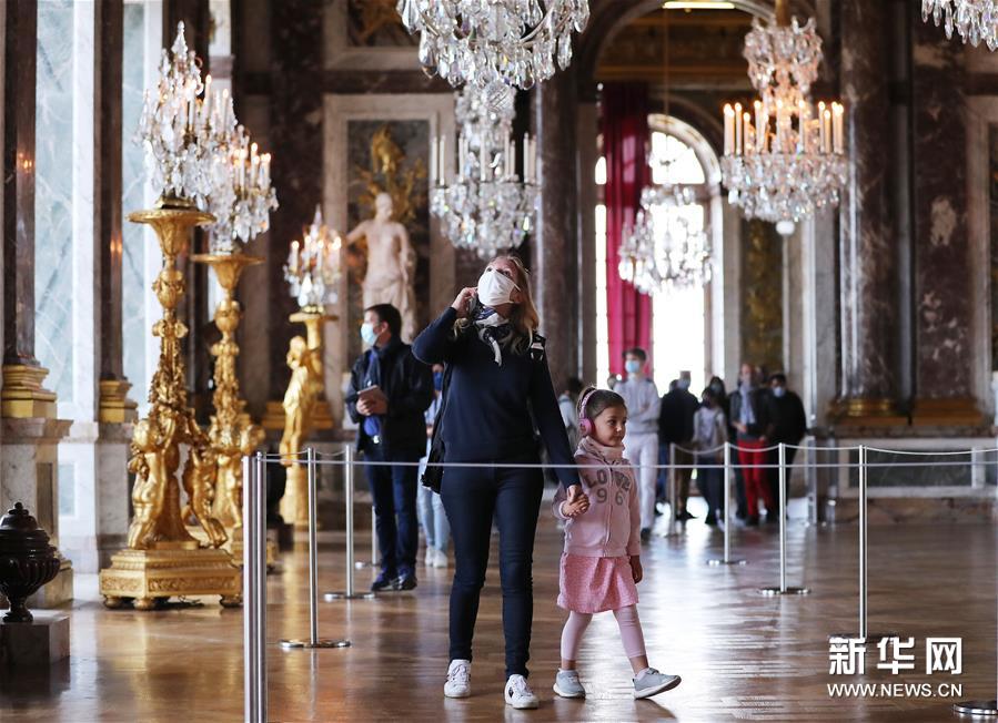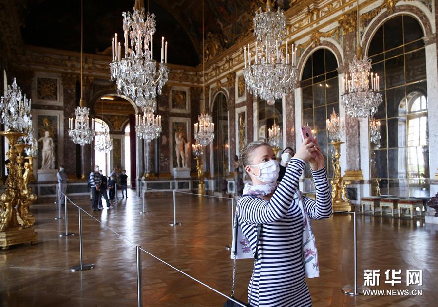6月6日,一名游客戴着口罩在法国巴黎近郊凡尔赛宫的镜厅内参观游览。新华社 记者 高静 摄