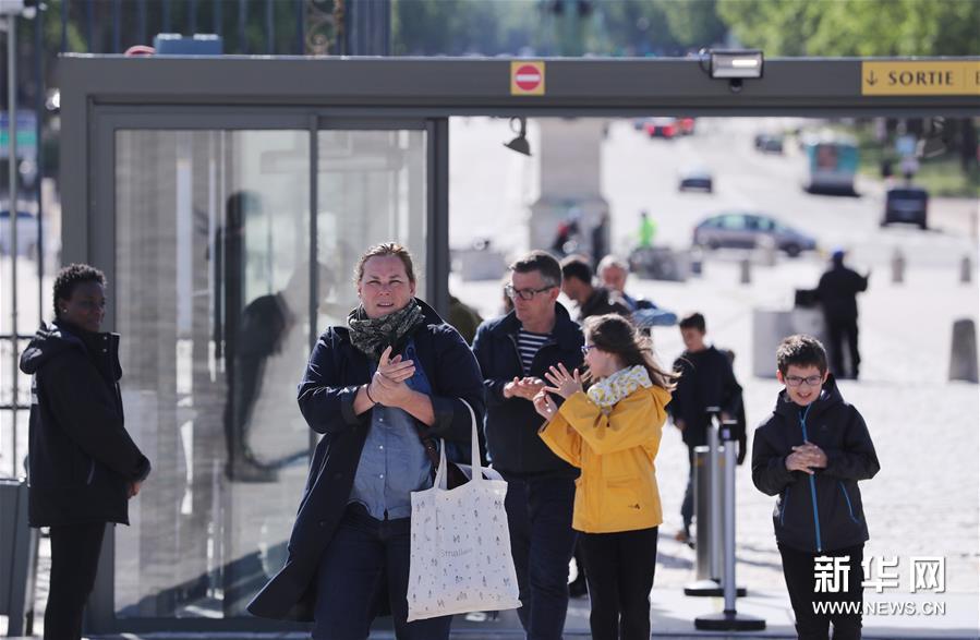 6月6日,在法国巴黎近郊的凡尔赛宫入口处,游客用景点提供的消毒免洗洗手液洗手。新华社 记者 高静 摄