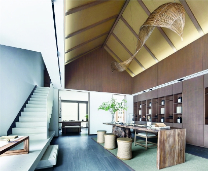 的确,不少空间经过设计师的融合跨界思维再造,让人有点傻傻分不清的感觉,甚至连原本商业气息浓郁的售楼处都可以变得充满佛系禅意,让人误以为这是一个休闲的文化场所。比如,柏年印象设计在南平武夷山捉刀设计的一处售楼中心,就牢牢扣住当地的茶文化,以及自然山水特色,“用艺术的思维去平衡商业价值”,营造出隐逸山居的休闲度假生活空间。