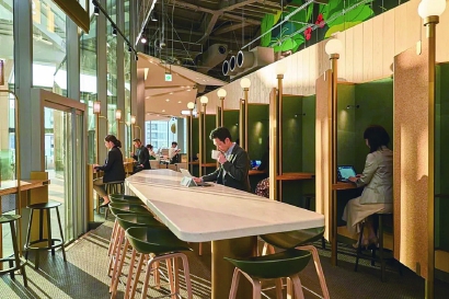 一直被白领当作第二办公室使用的连锁咖啡巨头,对共享办公概念窥探许久,干脆和铁路运营方联手,推出了首家共享办公门店。咖啡馆不再单纯是让人小憩和享用咖啡轻食的公共场所,摇身一变,以“智能休息室”(Smart Lounge)的设计概念,将空间分隔为窗边单人座位区、半封闭式包厢、付费私人包厢以及可供多人商谈的共享会议桌。从外远眺,依然是咖啡馆的窗明几净、简洁通透,但空间的功能却内有玄机。