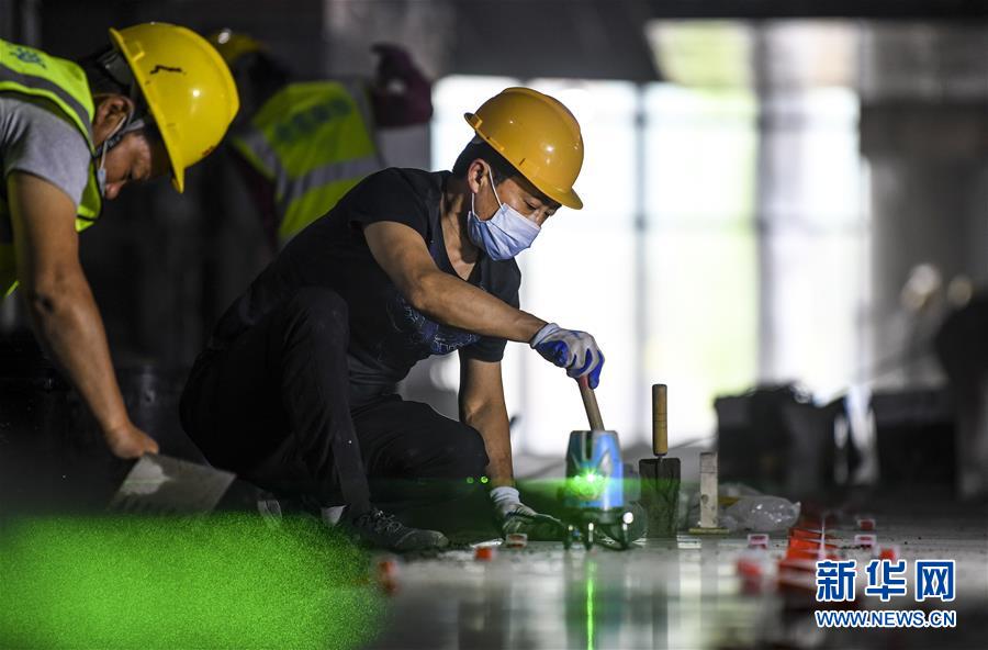 在乌鲁木齐市文化中心图书城施工现场,中建三局工人在铺设地面(6月19日摄)。新华社 记者 王菲 摄