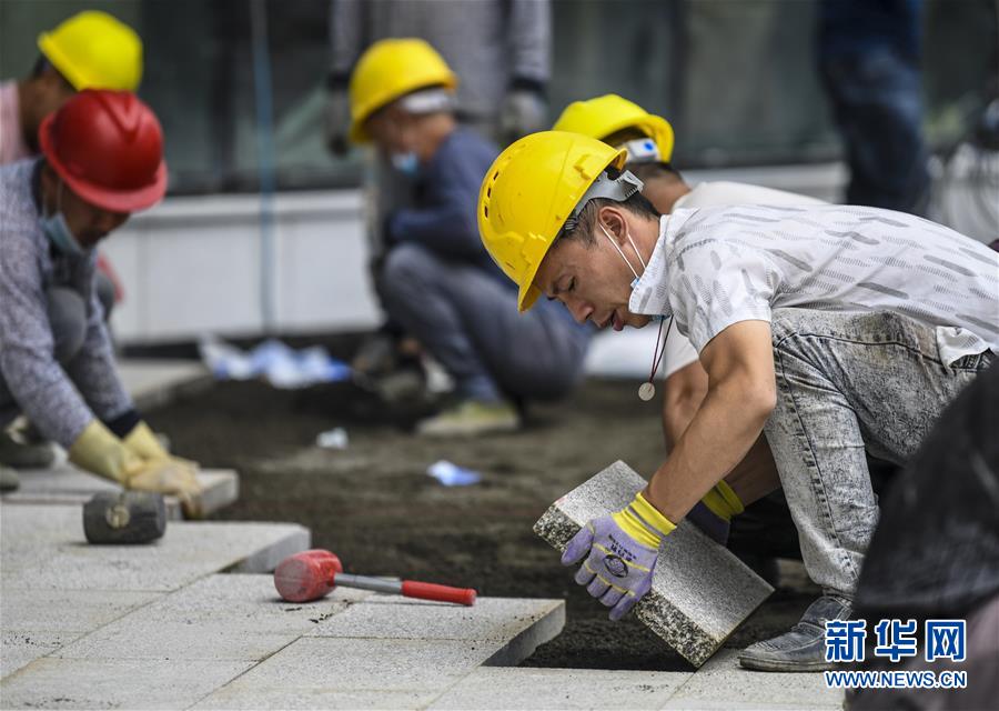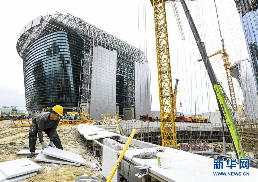 在乌鲁木齐市文化中心施工现场,中建三局工人在铺设地面(6月19日摄)。新华社 记者 王菲 摄