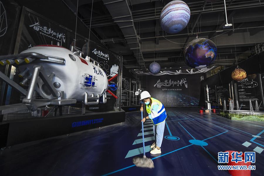 在乌鲁木齐市文化中心科技馆内,中建三局工作人员在打扫卫生(6月19日摄)。新华社 记者 王菲 摄
