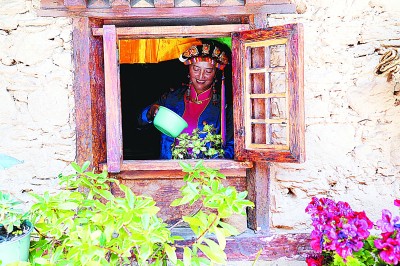 乡村振兴让四川省甘孜州丹巴县甲居藏寨越来越美丽,图为甲居镇甲居一村村主任唐秀英在浇花。光明日报 记者 闫汇芳 摄