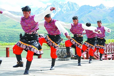 6月14日,在四川省甘孜州甘孜县,能歌善舞的藏族群众正在表演甘孜踢踏。光明日报 记者 闫汇芳 摄