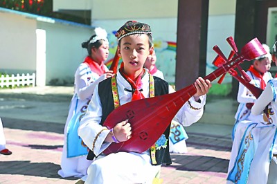四川省阿坝州松潘县城关小学“非物质文化遗产”文化课上,学生弹奏土琵琶。光明日报 记者 常莹 摄