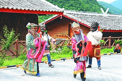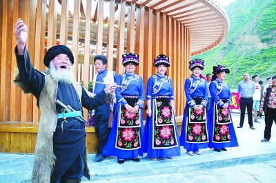 四川省阿坝州九寨沟县白马藏寨,村民们跳着舞欢迎远方的客人。本报记者常莹摄