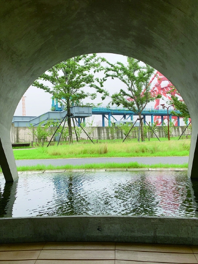 两个净水池装置立在电厂厂区和滨江码头区之间,处在一片野草丛中,净水设备被拆开,分别嫁接了别的元素,但从这些零件所透出的气息中,仍能隐约感到能量流淌千百遍的过程。其中一个净水池的功用是咖啡厅,它装上了辐射状劈锥拱壳体屋盖,从高处看,如展开双翅护住身下土地的小鸟,也如同一个来自海洋深处的贝壳。屋顶之下,是一个环形的镜面水池,曲折的屋檐与周边巨型吊车的景观倒影于水面之上,人们的视线穿越一汪净水,几丛野草,模糊了室内外的界限。