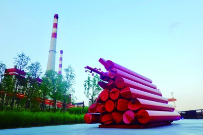 杨树浦发电厂烟囱和新建装置艺术相映成趣。首席记者 刘歆 摄